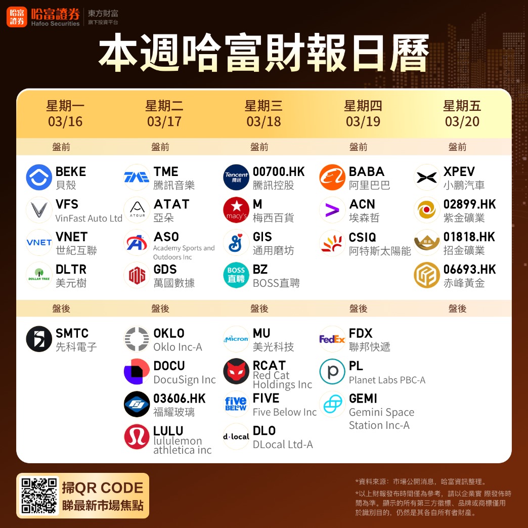 未来一周,港股科技巨头迎来财报密集披露窗口期, 腾讯控股(00700.HK) 、 阿里巴巴-W(09988.HK) 、 中国联通(00762.HK) 、 紫金矿业(02899.HK) 、 小鹏汽车-W(09868.HK) 、 吉利汽车(00175.HK) 等多家港股上市公司披露财报。同期美股的美光科技(MU.US) 、 Lululemon Athletica(LULU.US) 、 联邦快递(FDX.US) 和埃森哲(ACN.US) 等多家公司将公布最新季度业绩。