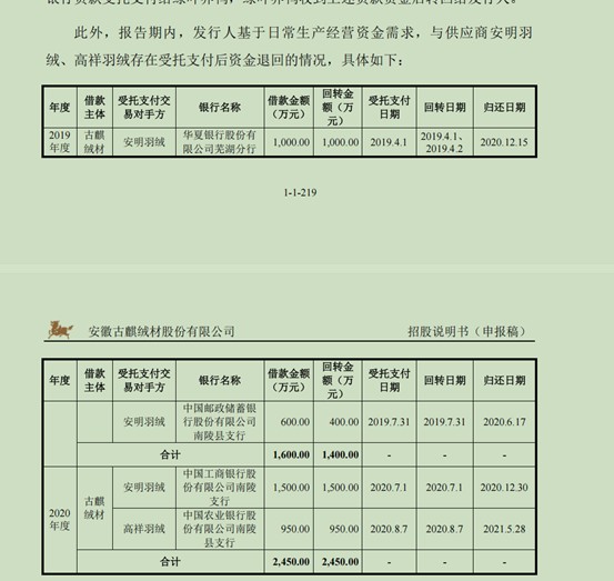 此外,界面新闻记者还发现,古麒绒材与安明羽绒、高祥羽绒曾有过“受托支付后资金退回”的转贷交易,相关款项总额为2450万元。该操作在财务审计中,属于典型的转贷行为。
