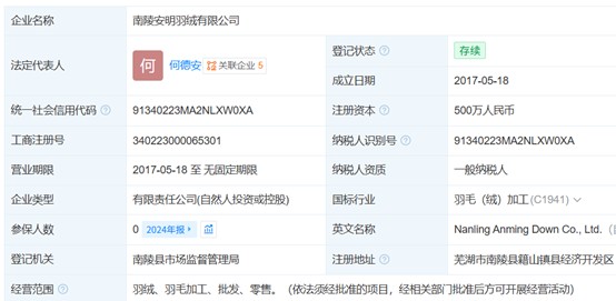 其中,南陵安明羽绒有限公司(下称“安明羽绒”)成立于2017年,注册资本500万元、实缴资本500万元,参保人数持续为零,主要人员3人。