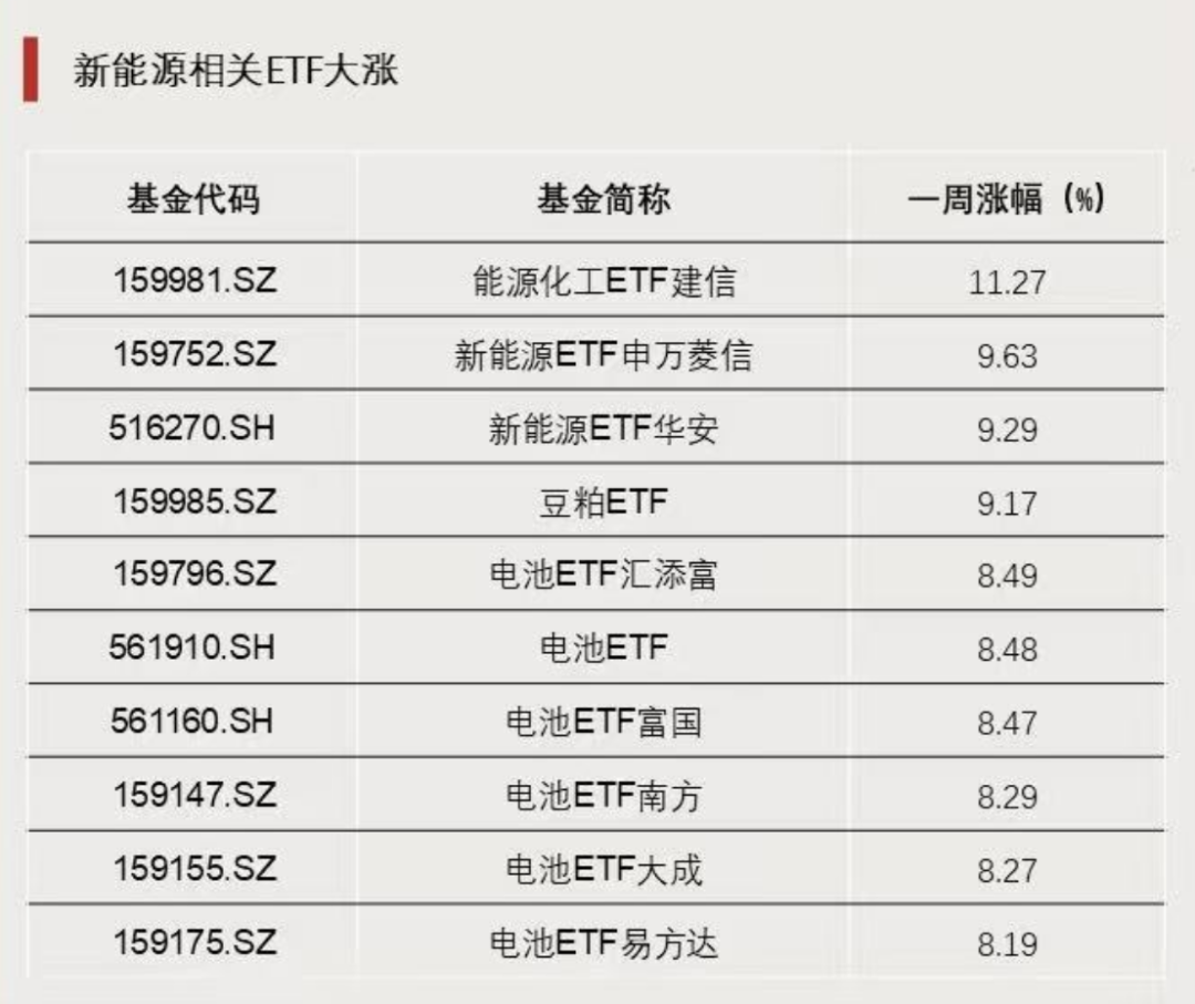 上周,新能源类指数涨幅居前,电池ETF易方达(159175)、储能电池ETF易方达(159566)、新能源ETF易方达(516090)、低碳ETF易方达(516070)等ETF标的指数大涨。