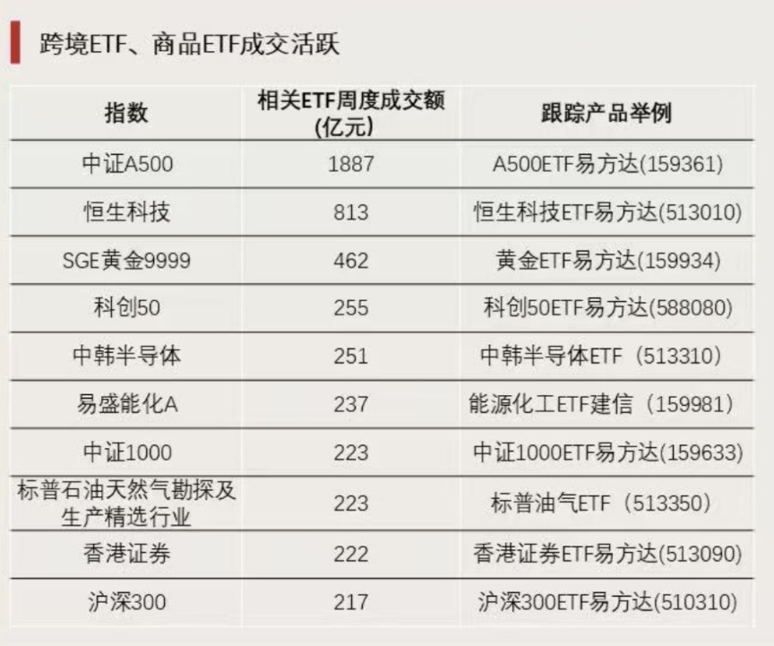 上周,贵金属板块震荡调整,SGE黄金9999相关ETF合计成交额462亿元,黄金ETF易方达(159934)等产品持续受到关注。整体来看,多类跨境ETF成交活跃,中韩半导体ETF、标普油气ETF等成交额居前。