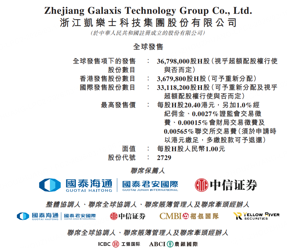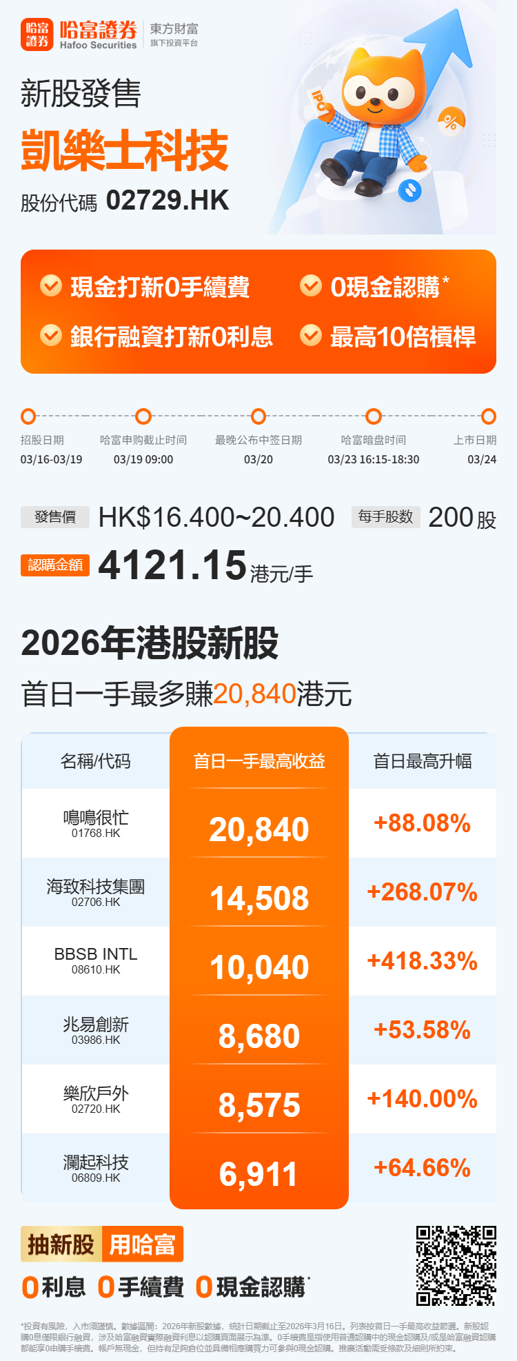 3月16日,凯乐士科技(02729)于3月16日-3月19日招股,拟全球发售3679.8万股H股,其中香港公开发售占约10%,国际发售占约90%,另有15%超额配股权。每股发售价16.4-20.4港元,每手200股,一手入场费4121.15港元,预期H股将于3月24日开始在联交所买卖。
