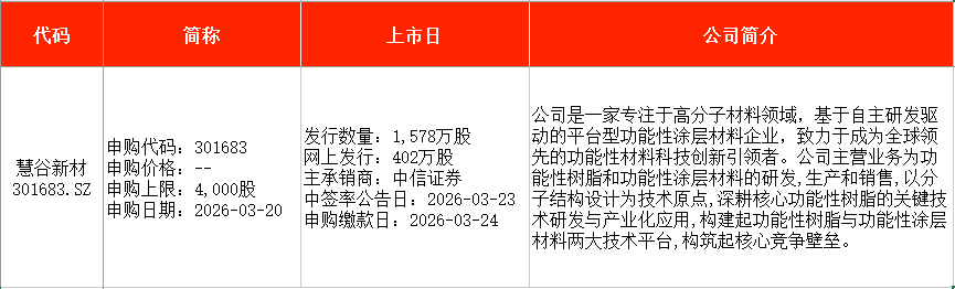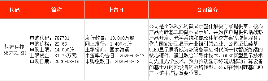 从时间表看,宏明电子(301682)、视涯科技(688781)、悦龙科技(920188)等在本周一(3月16日)申购;慧谷新材(301683)、泰金新能(688813)、盛龙股份(001257)等在本周五申购。