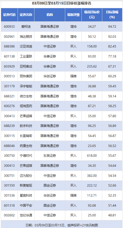 越声投研数据显示,3月9日至3月15日,券商给予上市公司目标价共123次,按最新收盘价计算,目标价涨幅排名居前的公司有爱柯迪、瑞达期货、泛亚微透,目标价涨幅分别为94.72%、92.03%、82.45%,分别属于汽车零部件、多元金融、塑料行业。