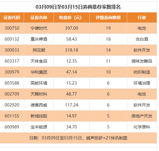 从券商推荐家数来看,3月9日至3月15日有207家上市公司得到券商推荐,其中宁德时代获得19家推荐,重庆啤酒获得18家推荐,同花顺获得14家推荐。