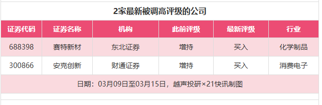 评级调高方面,3月9日至3月15日,券商调高上市公司评级达到2家次,最新数据包括了东北证券对赛特新材的评级从“增持”调高至“买入”,财通证券对安克创新的评级从“增持”调高至“买入”。