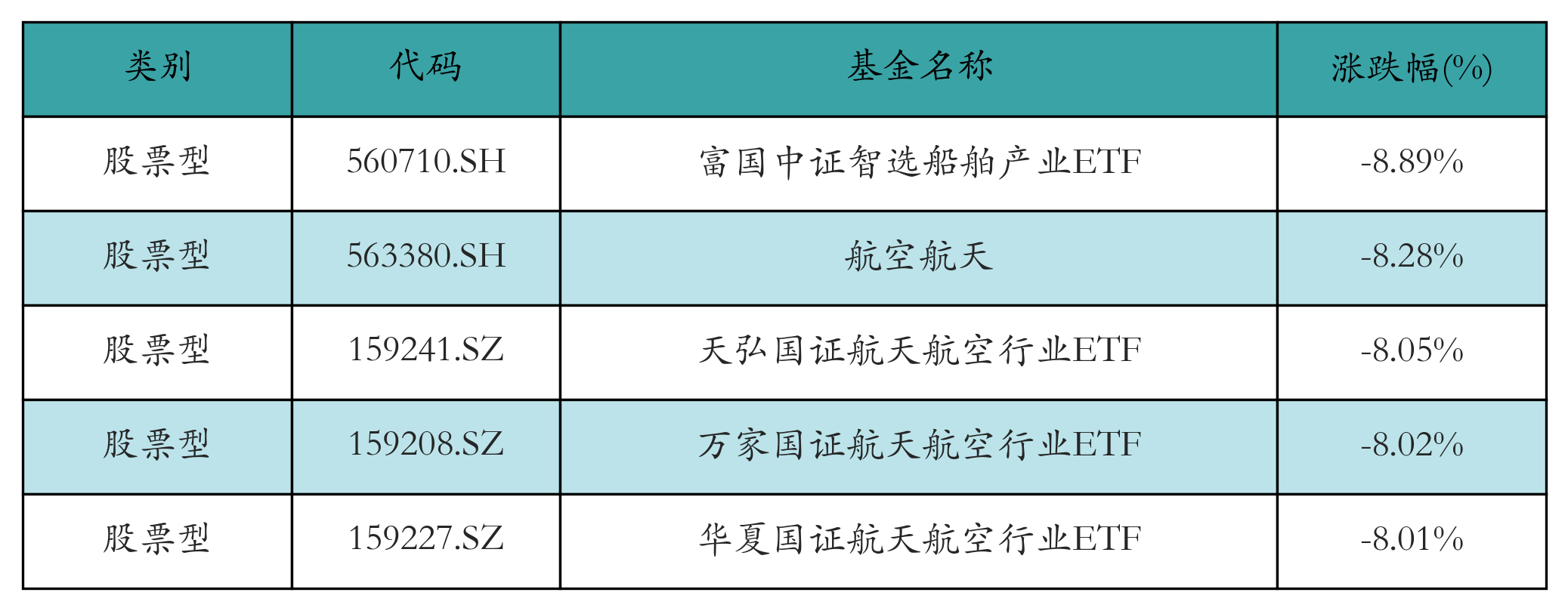 上周股票型ETF跌幅最大的5只ETF及其收益率分别为:富国中证智选船舶产业ETF(-8.89%)、航空航天(-8.28%)、天弘国证航天航空行业ETF(-8.05%)、万家国证航天航空行业ETF(-8.02%)、华夏国证航天航空行业ETF(-8.01%)。详情见下表: