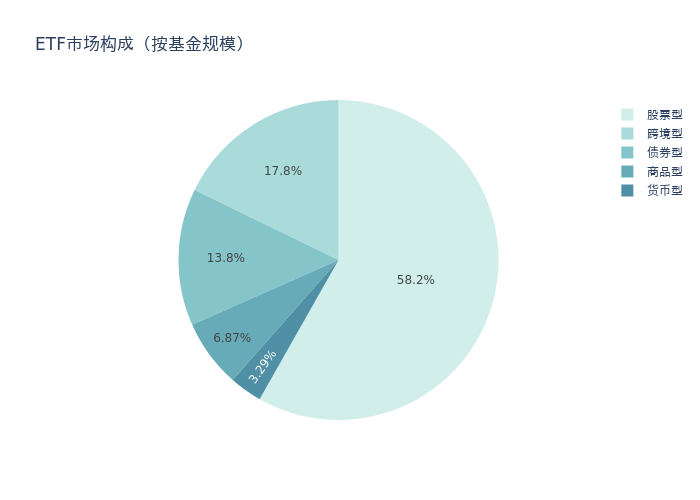 基金规模方面,上周ETF市场总规模达到52483.0亿元,较前一周减少534.41亿元。其中,股票型ETF为30550.9亿元,债券型ETF为7260.95亿元,货币型ETF为1725.1亿元,商品型ETF为3603.02亿元,跨境型ETF为9343.03亿元。