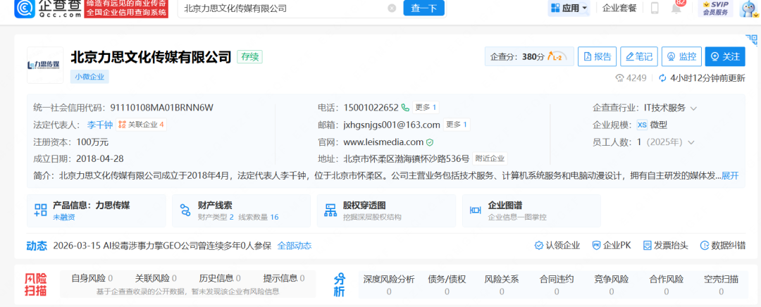 据企查查APP显示,涉事企业为北京力思文化传媒有限公司。该公司成立于2018年4月,注册资本100万元,企业类型为有限责任公司(自然人独资),2025年度参保人数为1人。公司主要经营技术服务、计算机系统服务和电脑动漫设计等业务,拥有自主研发的媒体发文及管理平台软件等。