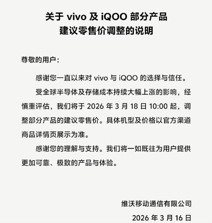 3月16日,vivo发布《关于vivo及iQOO 部分产品建议零售价调整的说明》称,受全球半导体及存储成本持续大幅上涨的影响,经慎重评估,vivo 将于2026年3月18日10:00起,调整部分产品的建议零售价,具体机型及价格以官方渠道商品详情页展示为准。