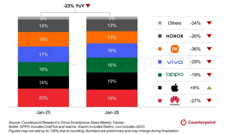 Counterpoint数据显示,2026年1月,中国智能手机销量同比下降23%,而vivo同比大跌29%,跌幅仅次于小米。