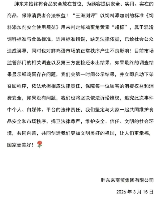 3月15日晚,胖东来官方旗舰店账号发布情况说明:“王海测评”以饲料添加剂的标准《饲料添加剂安全使用规范》用来判定鲜鸡蛋角黄素“超标”,属于混淆饲料标准与食品标准。