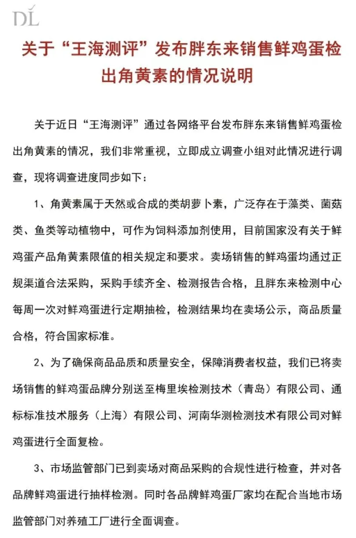 目前市场监管部门的相关调查以及第三方复检还未出结果,如果最终的调查结果显示鲜鸡蛋存在问题,会第一时间公示结果,并立即启动下架召回程序,依法承担相应法律责任。如果没有问题,胖东来也将坚决依法诉讼维权,追究此次事件中个人、自媒体、平台的法律责任。