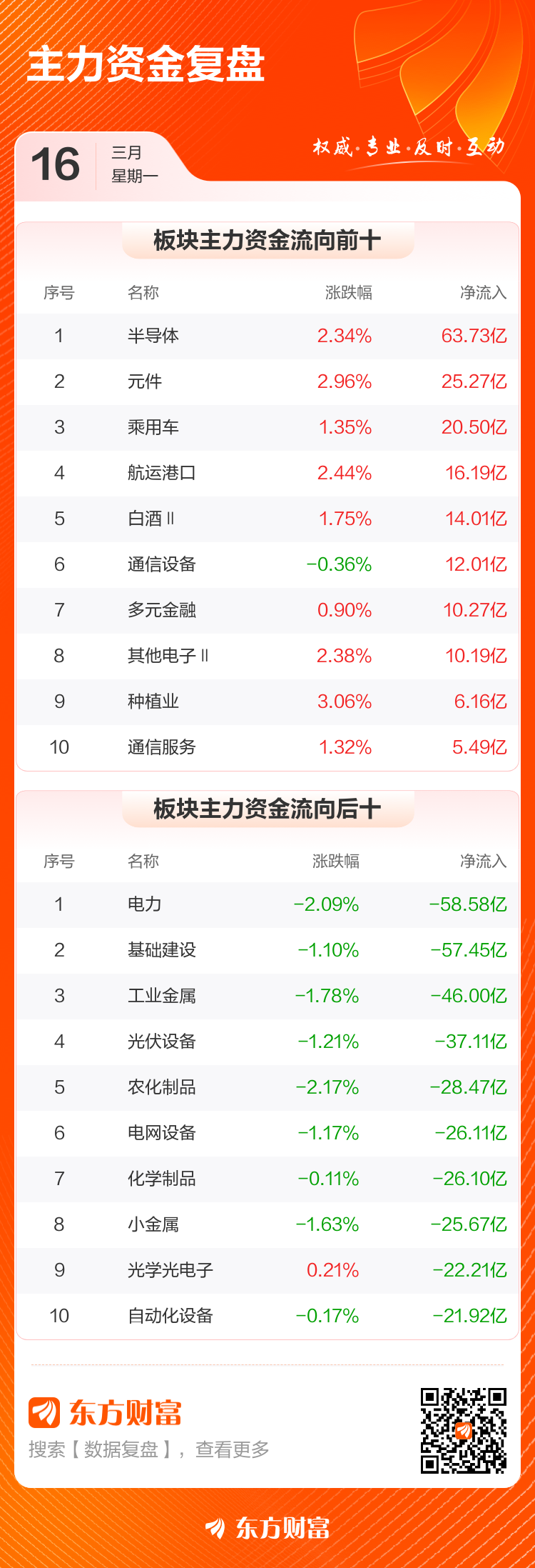3月16日,沪指跌0.26%,深成指涨0.19%,创业板指涨1.41%。两市成交额2.33万亿,较上个交易日缩量750亿。数据显示,今日大盘主力资金净流出430.85亿。半导体、元件、乘用车等板块主力资金流入排名居前,其中半导体净流入63.73亿元。