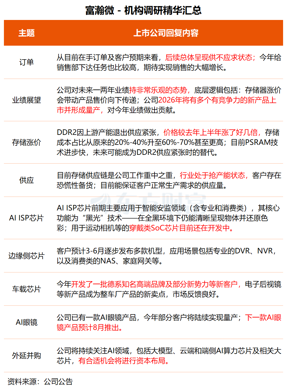 据富瀚微介绍,2026年公司新产品包括:AI ISP芯片今年将实现较大的量增长,前期主要应用于智能安监领域,应用于Go Pro或影石这类便携式运动相机应用的SoC芯片在开发中;边缘侧芯片:客户预计3-6月逐步发布多款机型,应用场景包括专业的DVR、NVR,以及消费类的NAS、家庭网关等;AIoT芯片:应用于智能门铃、智能显示、智能电动车等场景;车载芯片:今年开发了一批德系知名高端品牌及部分新势力等新客户,电子后视镜等新产品成为整车厂产品的新卖点,市场反馈良好。