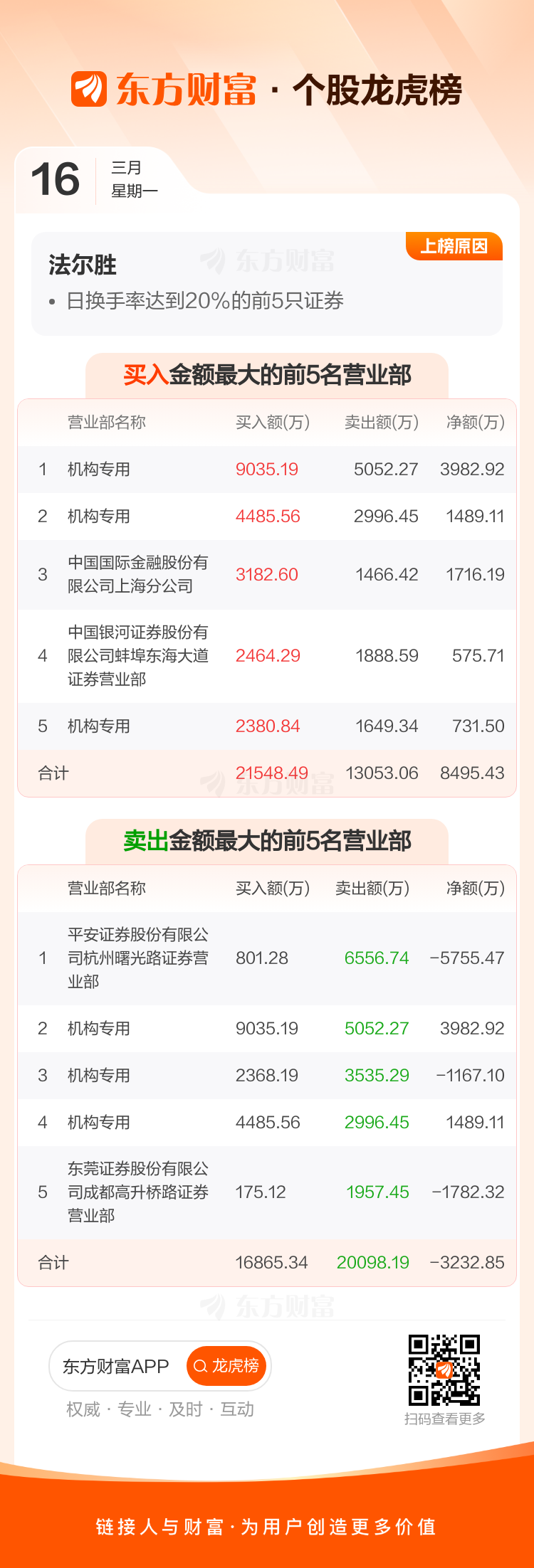 交易所2026年3月16日公布的交易公开信息显示,法尔胜因成为日换手率达到20%的前5只证券上榜。法尔胜当日收报12.2元,涨跌幅10.01%,偏离值31.12%,换手率31.12%,成交额15.31亿。