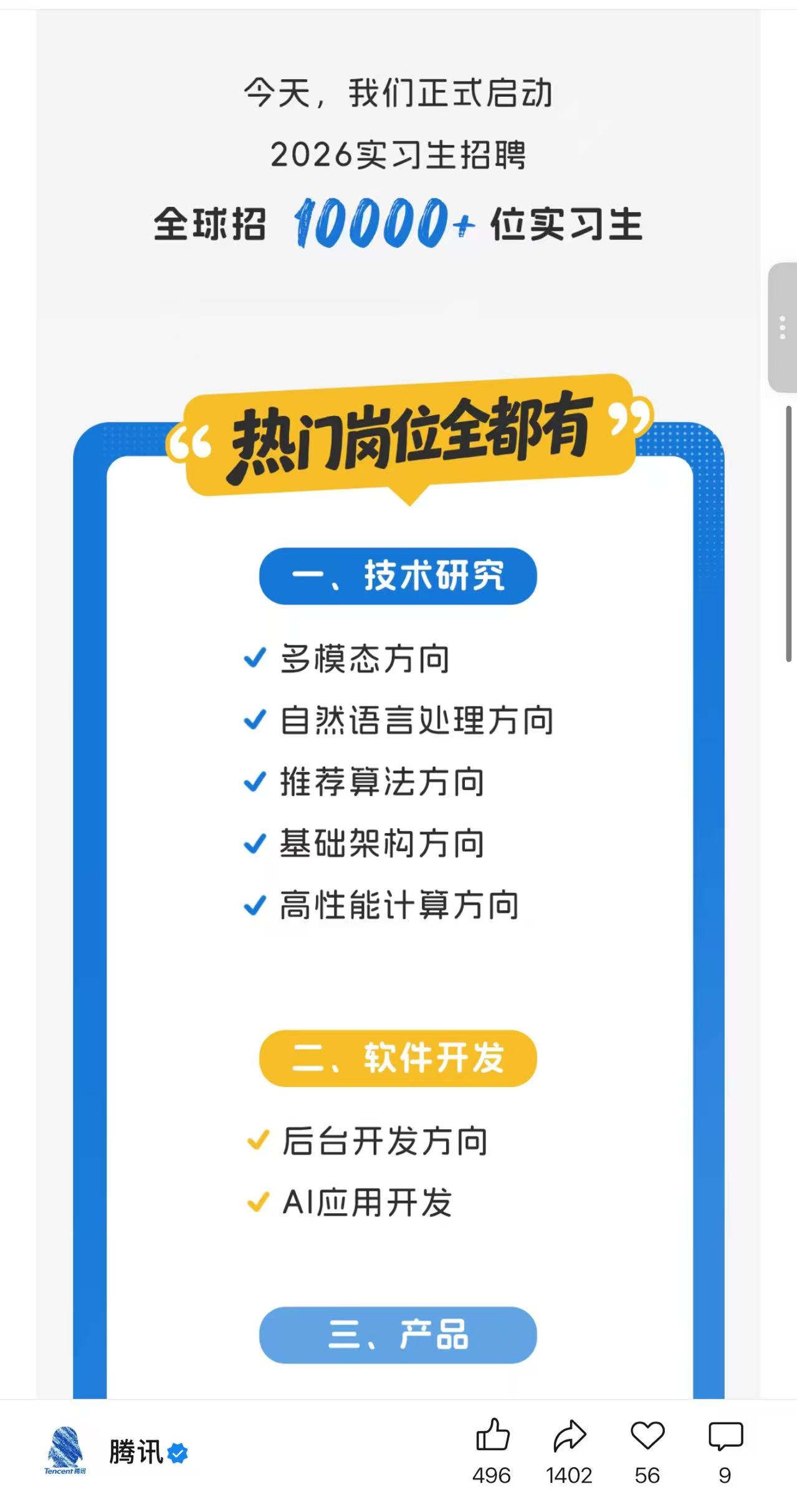 3月6日,腾讯宣布启动2026实习生招聘,面向全球,提供超过一万个实习机会。主要面向毕业时间在2026年9月-2027年12月的在校大学生。岗位分为技术、产品、设计、市场、职能五大类。