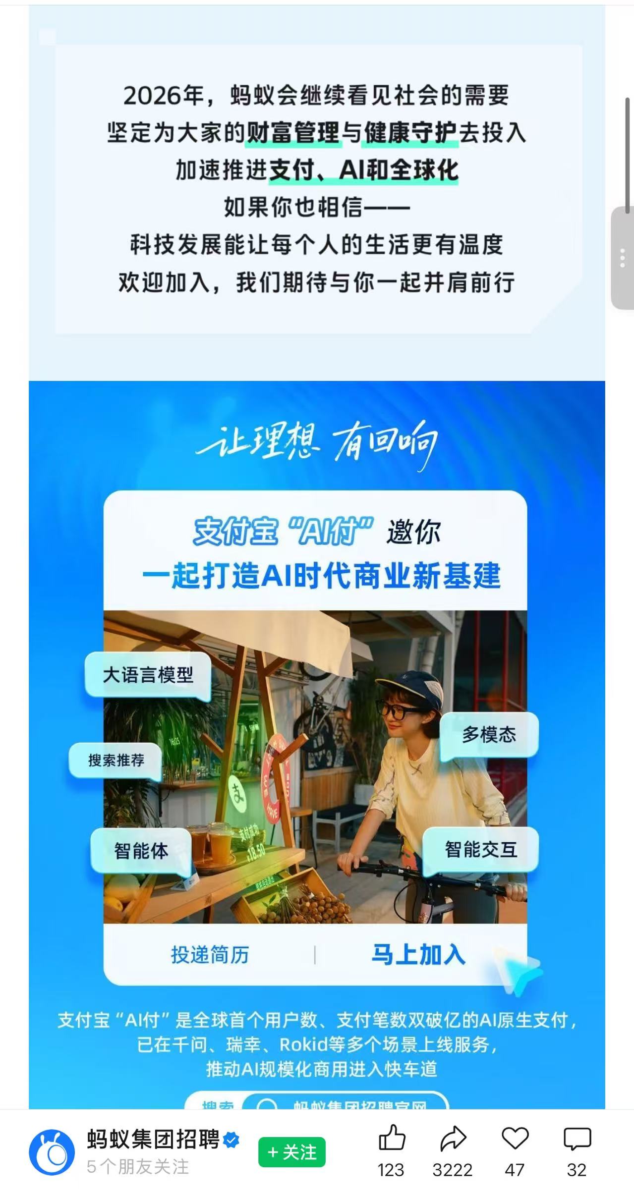 具体来看,支付宝“AI付”需要大语言模型、多模态、智能体、智能交互等方面的AI人才;蚂蚁阿福需要大模型、算法评测、自然语言、算法工程等方面的AI人才;蚂蚁财富需要AI工程、算法评测、搜索推荐等方面的AI人才;蚂蚁灵光需要RL Infra、AI搜索、音频算法等人才,蚂蚁inclusion AI需要具身智能、多模态大模型、AI infra、智能体等人才。