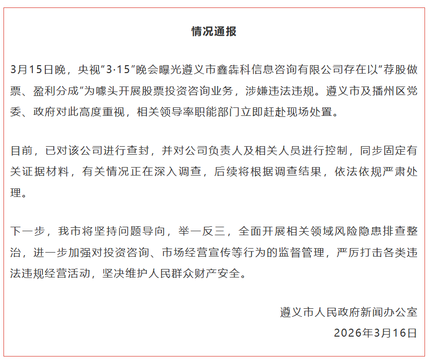 3月16日,据贵州遵义市人民政府新闻办公室通报,3月15日晚,央视“3·15”晚会曝光遵义市鑫犇科信息咨询有限公司存在以“荐股做票、盈利分成”为噱头开展股票投资咨询业务,涉嫌违法违规。