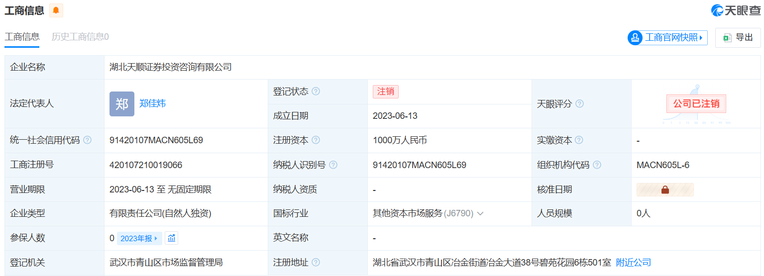 天眼查资料显示,天顺投资成立于2023年6月,法定代表人为郑佳炜,注册资本1000万人民币,经营范围包括证券投资咨询、第二类增值电信业务、以自有资金从事投资活动等,由郑佳炜全资持股。不过,该公司已于2024年7月注销。