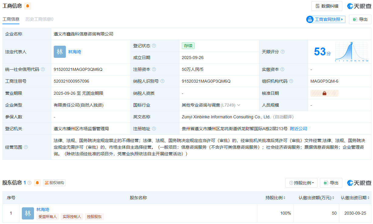 据天眼查,遵义市鑫犇科信息咨询有限公司(下称“鑫犇科咨询”)成立于2025年9月,法定代表人为林海埼,林海埼的持股比例为100%。