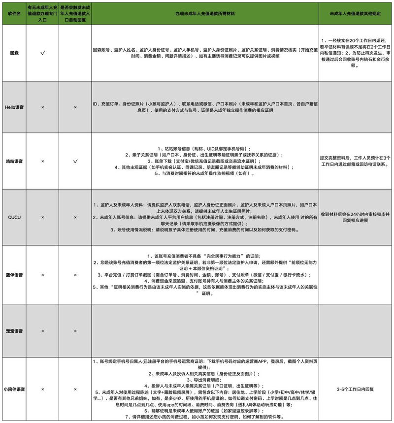 记者还借家长名义试图在上述语音软件进行未成年人退款,发现在前述7款语音社交软件中,仅回森在软件内设置了专门的未成年人打赏退款处理渠道,其余软件均从客服通道解决。