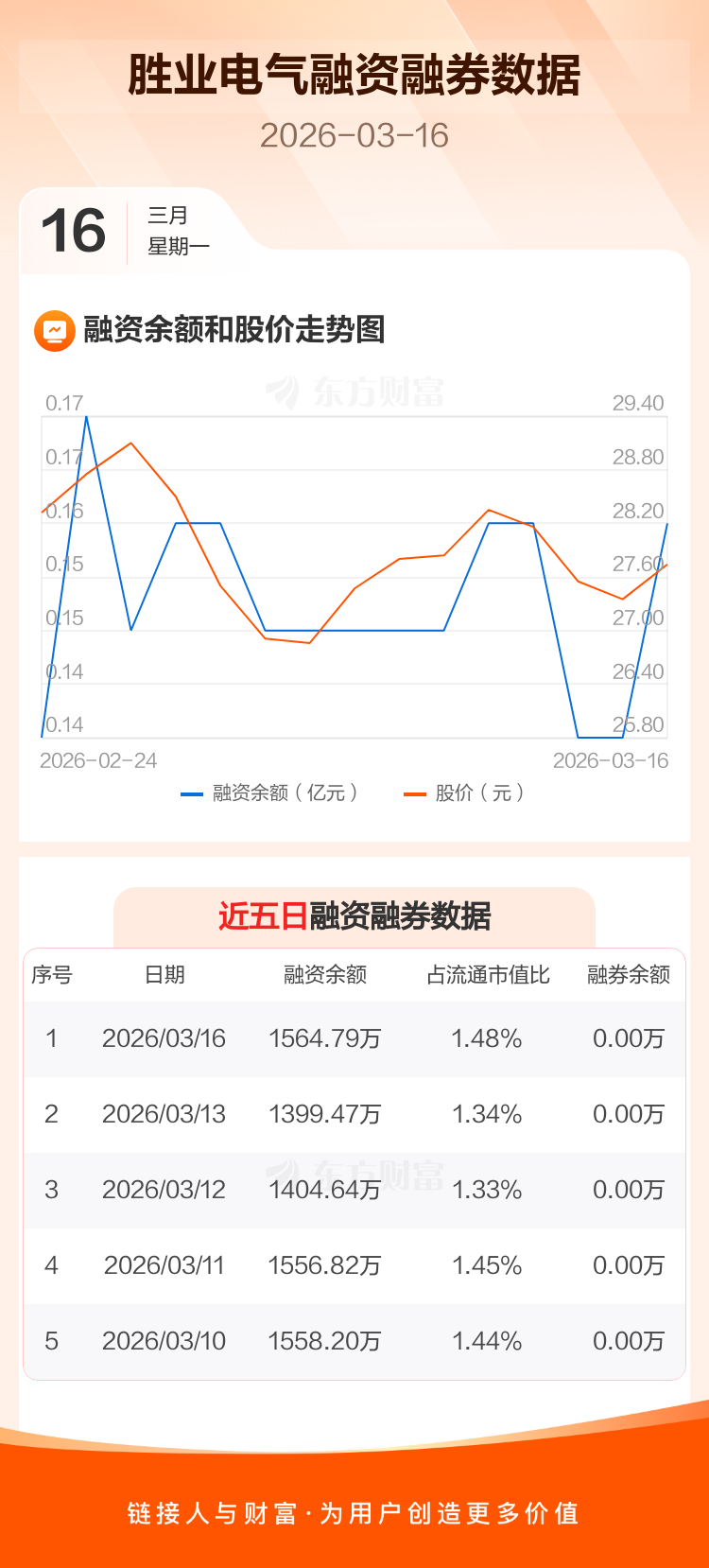 交易所最新数据显示,胜业电气于2026年3月16日获融资买入276.50万元,融资偿还111.18万元,当日融资净买入165.32万元。目前,该股融资余额1564.79万,占流通市值比例为1.48%。