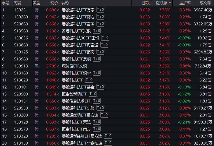 在港股科技股大涨带动下,港股相关ETF当日表现霸榜全市场。数据显示,3只港股通科技ETF涨超3.5%,最高涨幅达3.75%,多只港股相关ETF涨超3%。