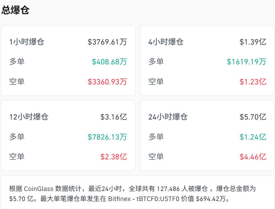 根据CoinGlass数据统计,最近24小时,全球共有127,486人被爆仓,爆仓总金额为5.70亿美元。其中,多单为1.24亿美元,空单达4.46亿美元。