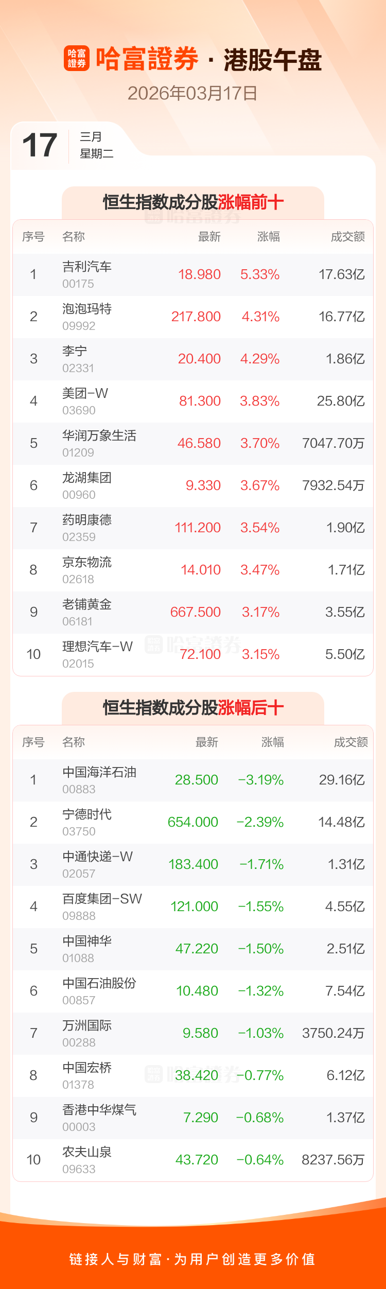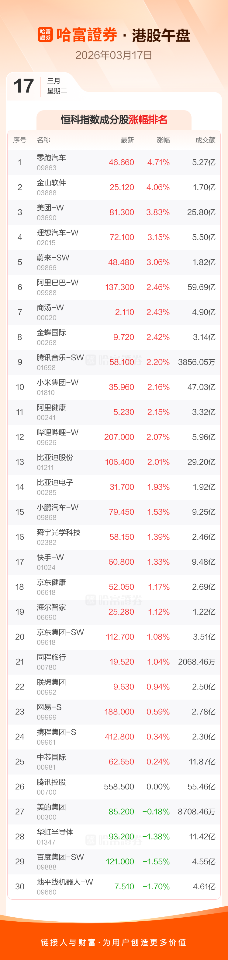 港股3月17日午盘走高,恒生指数收报26088.07点,涨254.05点,涨幅0.98%;恒生科技指数收报5180.49点,涨68.71点,涨幅1.34%。恒生指数成分股中吉利汽车、泡泡玛特、李宁涨幅居前,中国海洋石油、宁德时代、中通快递-W跌幅靠前。恒生科技指数成分股中零跑汽车、金山软件、美团-W涨幅居前,地平线机器人-W、百度集团-SW、华虹半导体跌幅靠前。