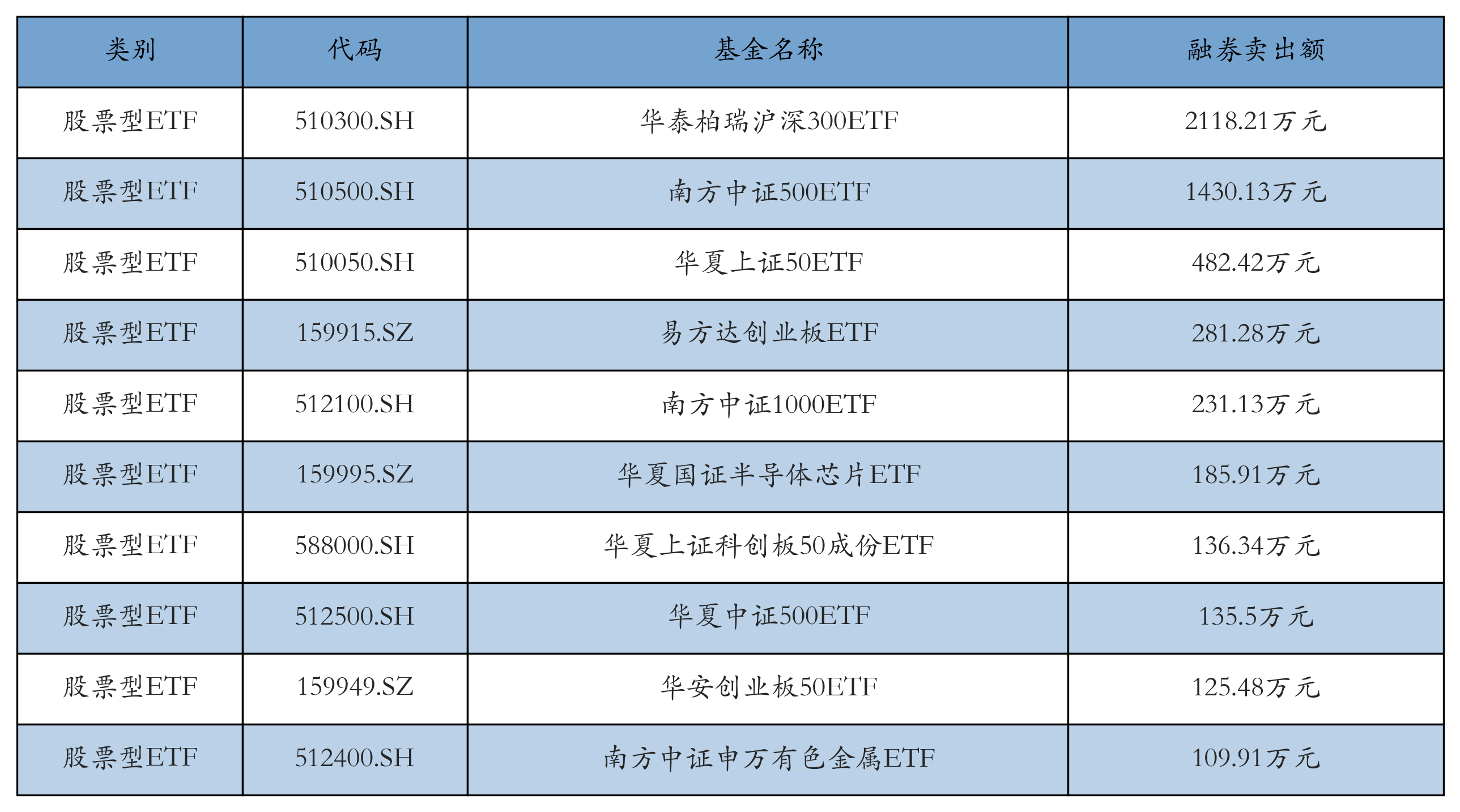 昨日股票型ETF融资卖出额最高的3只ETF及其卖出金额分别为:华泰柏瑞沪深300ETF(2118.21万元)、南方中证500ETF(1430.13万元)、华夏上证50ETF(482.42万元)。融券卖出额前10详情见下表:
