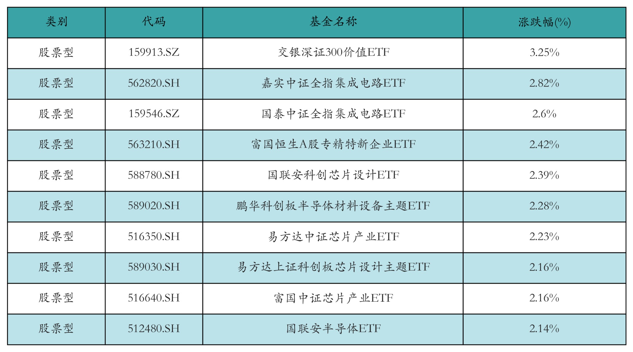 昨日股票型ETF涨幅最高的3只ETF及其收益率分别为:交银深证300价值ETF(3.25%)、嘉实中证全指集成电路ETF(2.82%)、国泰中证全指集成电路ETF(2.6%)。涨幅前10详情见下表: