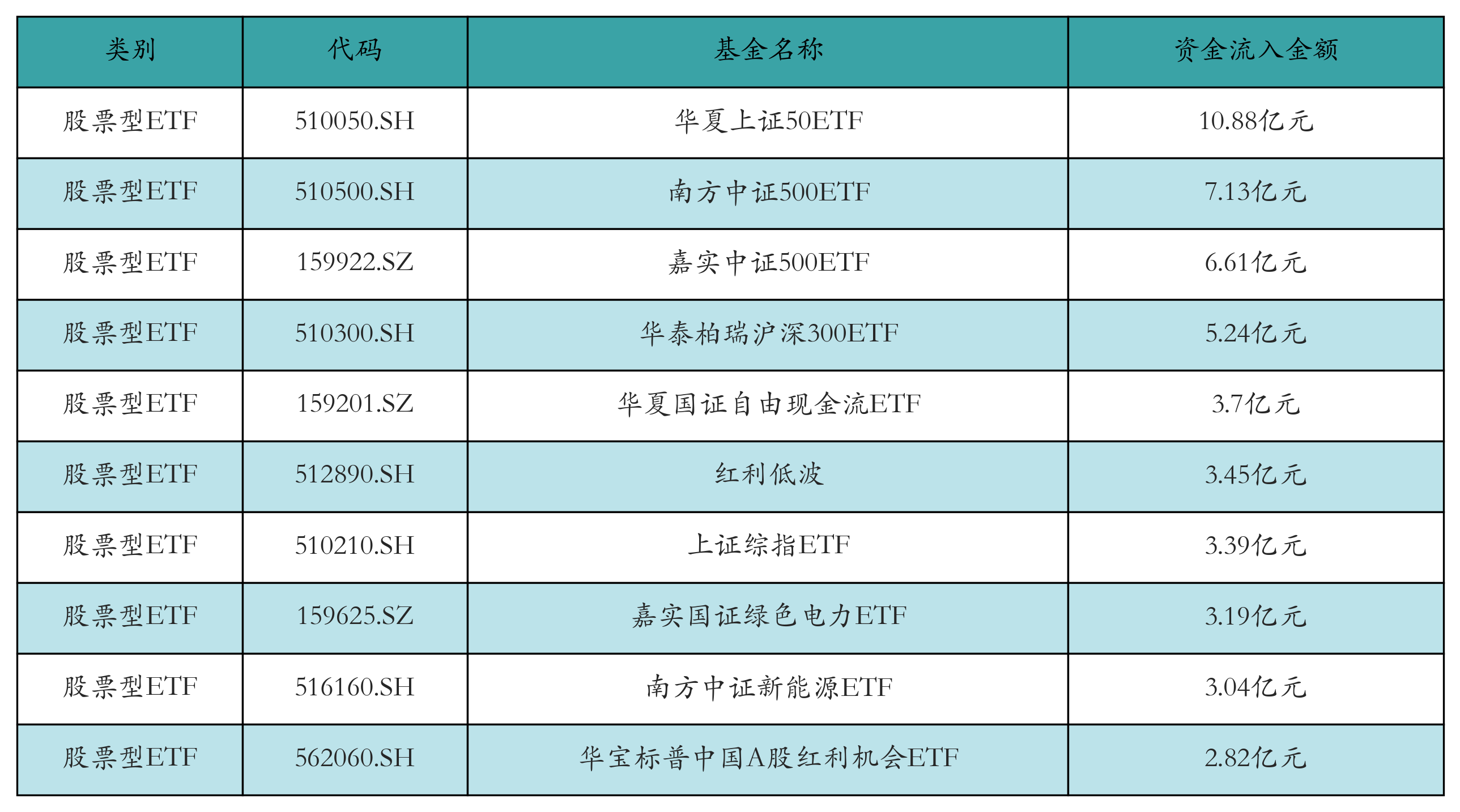 昨日股票型ETF资金流入最多的3只ETF及其流入金额分别为:华夏上证50ETF(流入10.88亿元)、南方中证500ETF(流入7.13亿元)、嘉实中证500ETF(流入6.61亿元)。资金流入前10详情见下表: