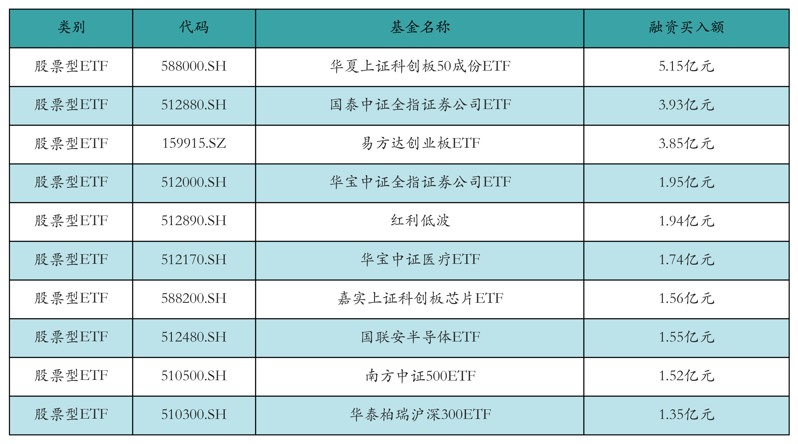 昨日股票型ETF融资买入额最高的3只ETF及其买入金额分别为:华夏上证科创板50成份ETF(5.15亿元)、国泰中证全指证券公司ETF(3.93亿元)、易方达创业板ETF(3.85亿元)。融资买入额前10详情见下表: