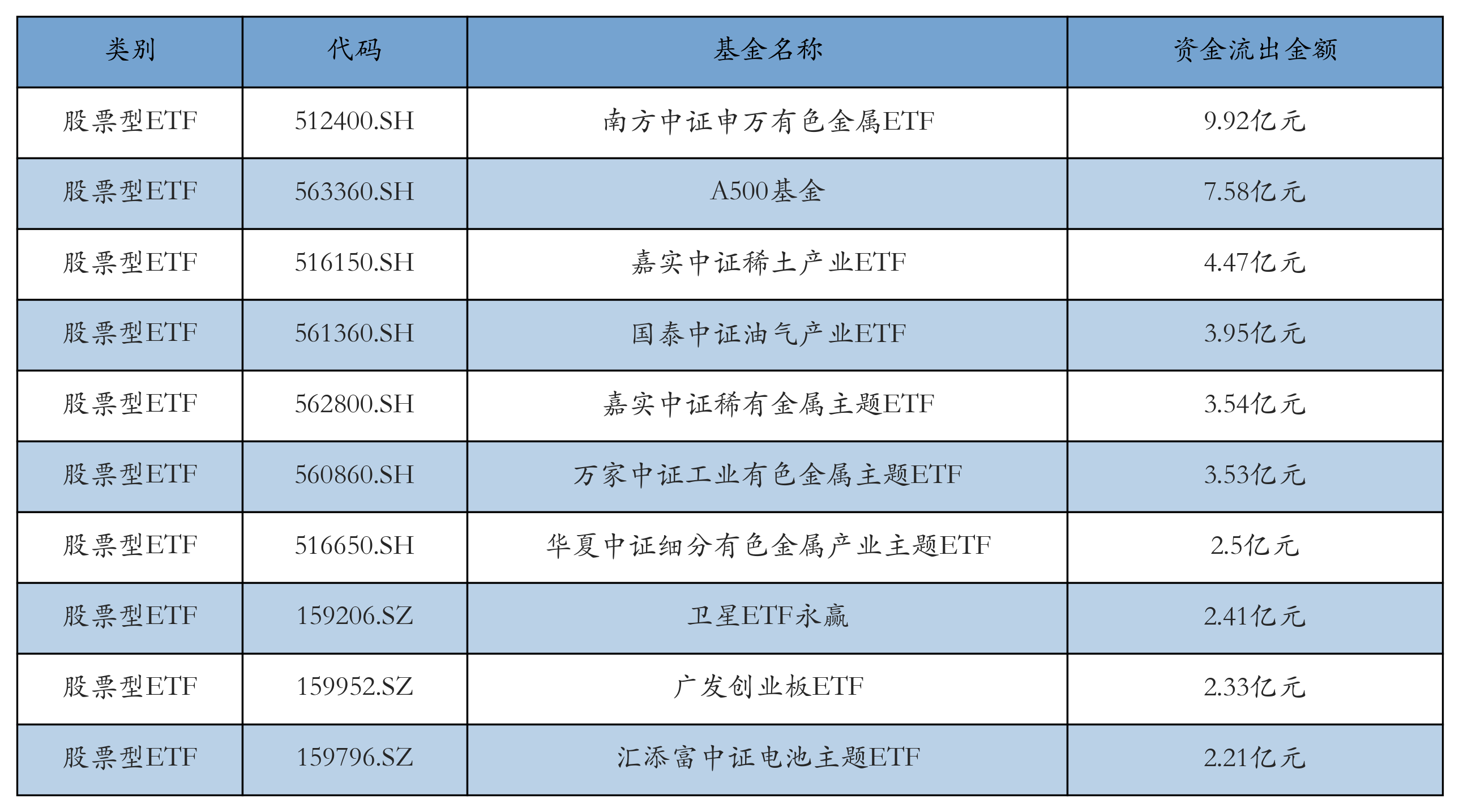 昨日股票型ETF资金流出最多的3只ETF及其流出金额分别为:南方中证申万有色金属ETF(流出9.92亿元)、A500基金(流出7.58亿元)、嘉实中证稀土产业ETF(流出4.47亿元)。资金流出前10详情见下表: