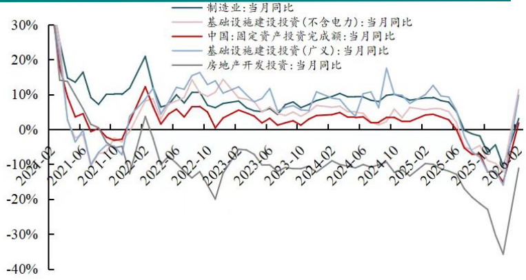 另外,随着油价攀升且沿着产业链传导,输入性通胀压力有望支撑国内PPI转正时点提前,对名义增长修复形成提振。受春节效应和国际大宗商品价格上行影响,2月CPI和PPI均超预期。同时,2月信贷数据也显现出淡季不淡的特征。2月新增人民币贷款9000亿元,略高于预期,同比少增1100亿元,但2月工作日较少,信贷投放强度整体不算弱。1月和2月合计新增人民币贷款56100亿元,同比少增约5000亿元。从结构上看,企业与居民部门的分化进一步加剧,企业端表现强劲,主要受银行早投放早收益思路、年初政策性项目配套融资需求释放的支撑,而居民端持续承压,购房意愿回升不明显。后续信用扩张的持续性仍需依赖房地产市场企稳和居民收入预期改善。
