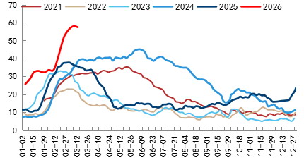 受中东地缘冲突升级影响,国际油价飙升、美联储降息预期下修、非美货币集体走弱等因素使得美元指数走强。同时,霍尔木兹海峡航运受阻,布伦特原油价格走高,市场担忧高油价延缓通胀回落节奏。交易员大幅下调2026年美联储降息预期,从年初预计的3~4次降至仅1次25BP,且降息时点推迟至9月以后。此外,高油价也冲击欧元区、日本等经济体能源进口,可能导致其经济复苏乏力,欧元、日元持续走弱。随着美元指数上涨,铜等有色品种价格普遍承压。