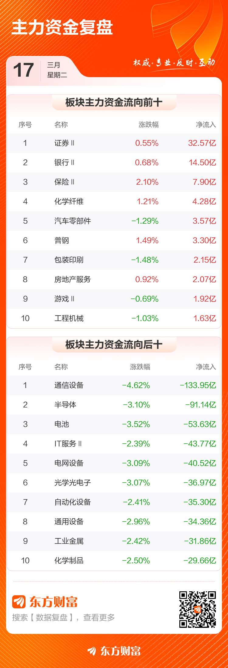 3月17日,沪指跌0.85%,深成指跌1.87%,创业板指跌2.29%。两市成交额2.21万亿,较上个交易日缩量1175亿。数据显示,今日大盘主力资金净流出972.01亿。证券Ⅱ、银行Ⅱ、保险Ⅱ等板块主力资金流入排名居前,其中证券Ⅱ净流入32.57亿元。