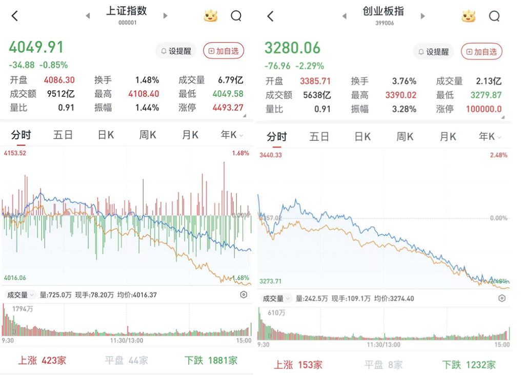 至收盘,上证综指跌0.85%,报4049.91点;科创50指数跌2.23%,报1354.15点;深证成指跌1.87%,报14039.73点;创业板指跌2.29%,报3280.06点。