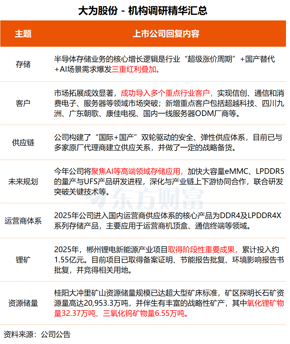 在调研中,大为股份表示,2025年,公司半导体存储业务市场拓展成效显著,成功导入多个重点行业客户,实现信创、通信和消费电子、服务器等领域市场突破,标志着公司客户结构实现了行业高端化、需求定制化、合作战略化的升级。