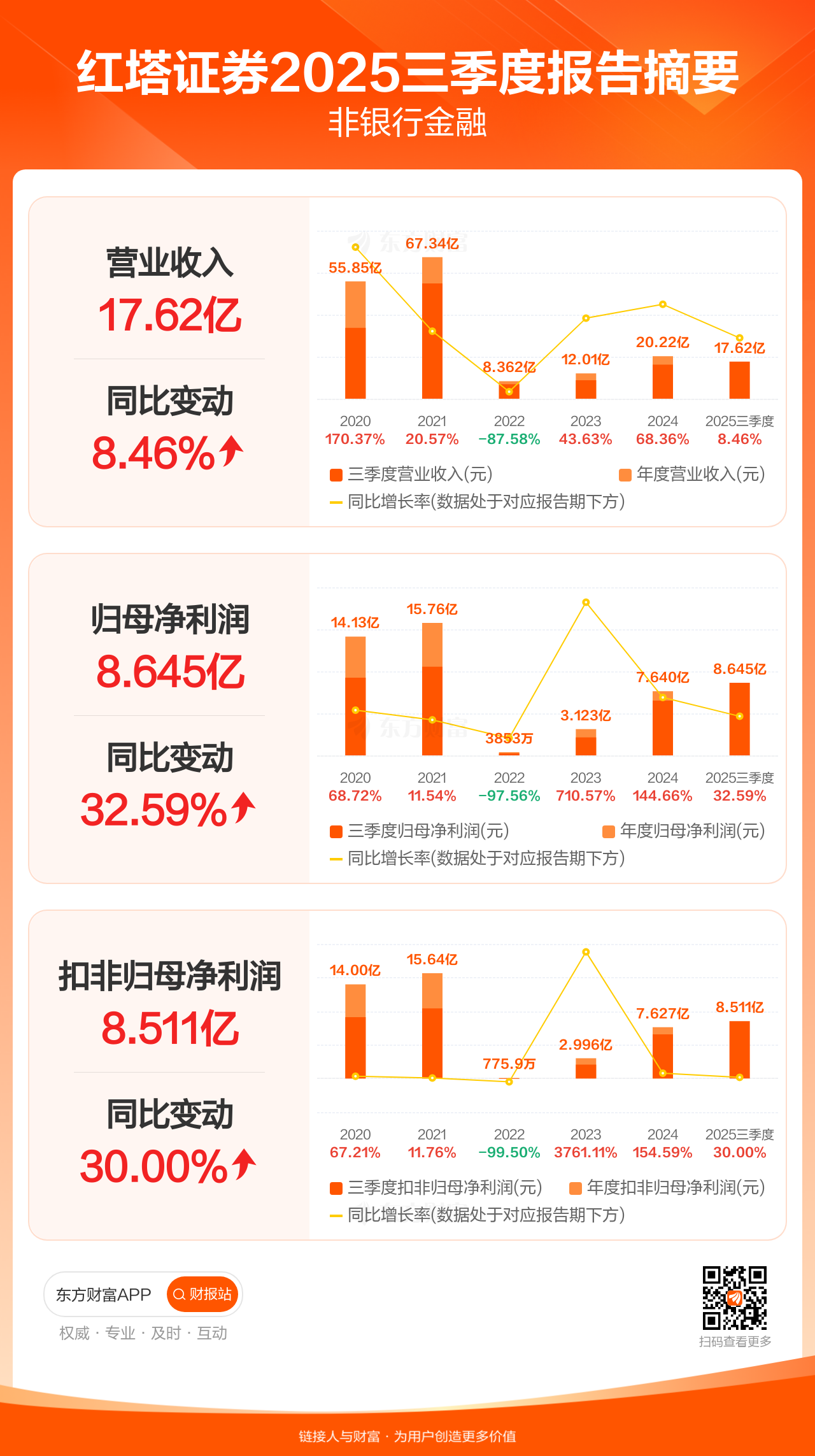 红塔证券10月31日发布2025年三季报显示,公司前三季实现营业收入17.62亿元,同比增长8.46%;归母净利润8.64亿元,同比增长32.59%;扣非归母净利润8.51亿元,同比增长30.00%。