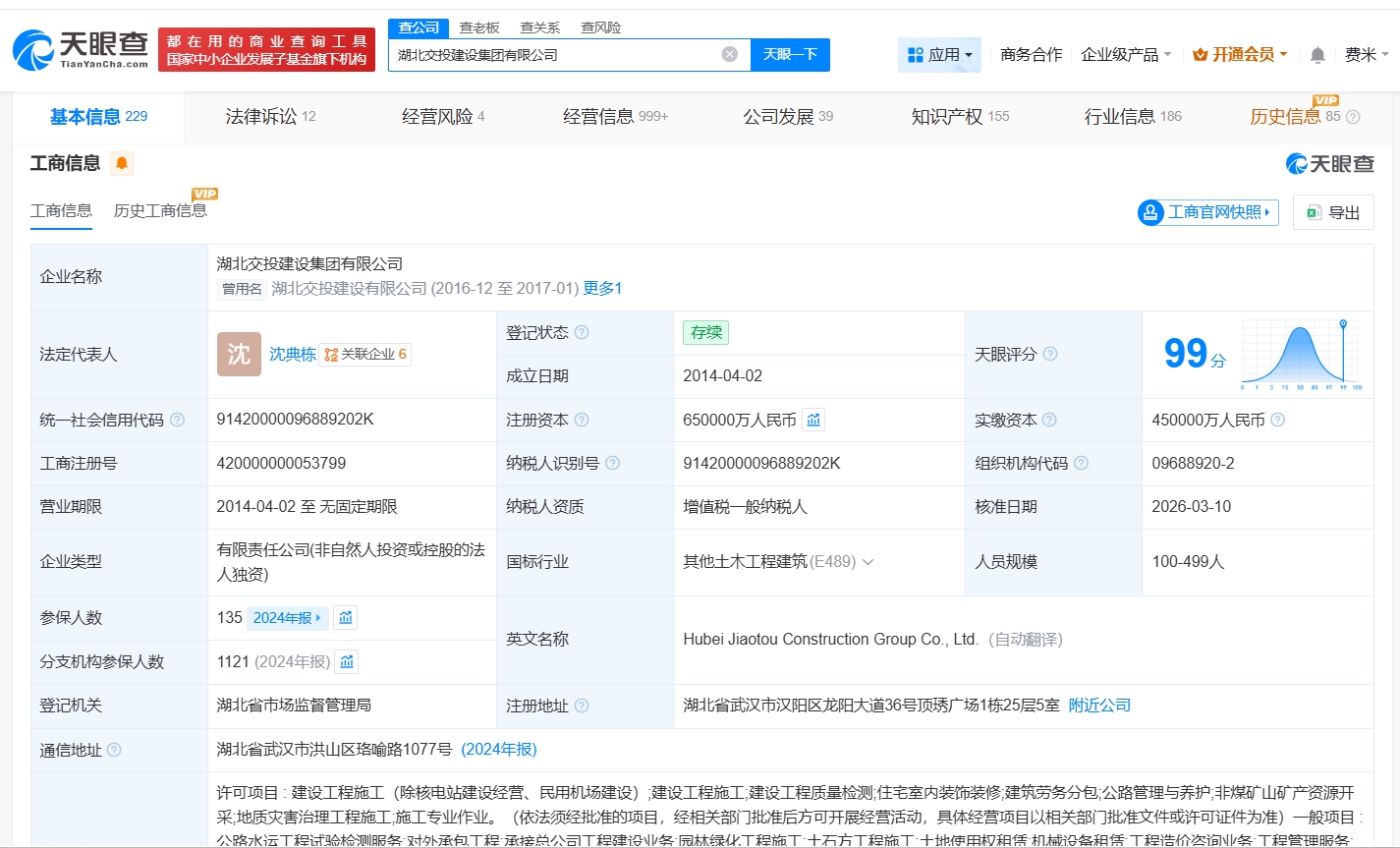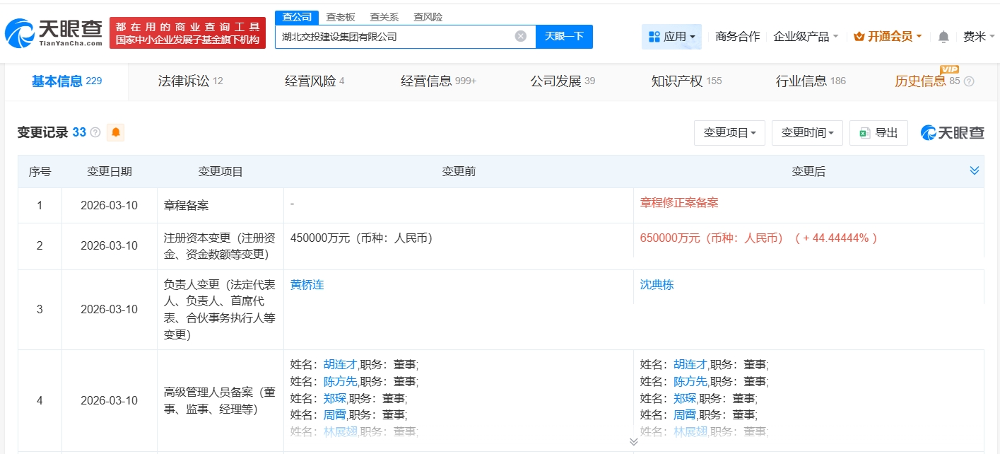 每经AI快讯,天眼查App显示,近日,湖北交投建设集团有限公司发生工商变更,黄桥连卸任法定代表人、董事长,由沈典栋接任,同时,注册资本由45亿元人民币增至65亿元人民币,增幅约44%。湖北交投建设集团有限公司成立于2014年4月,经营范围包括建设工程施工、公路水运工程试验检测服务、园林绿化工程施工等。股东信息显示,该公司由湖北交通投资集团有限公司全资持股。