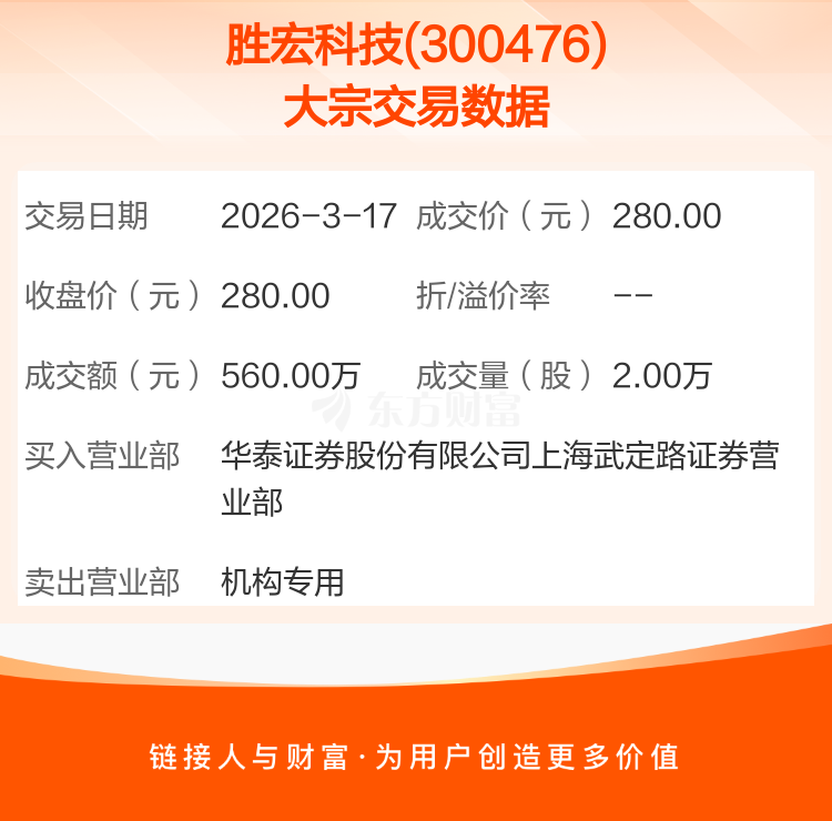 2026年3月17日,胜宏科技发生1笔大宗交易,共成交2.00万股,成交金额560.00万元。
