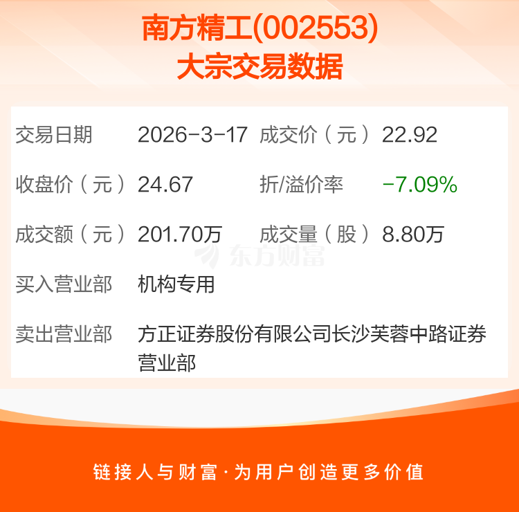 2026年3月17日,南方精工发生1笔大宗交易,共成交8.80万股,成交金额201.70万元,占其流通市值比例为0.03%。