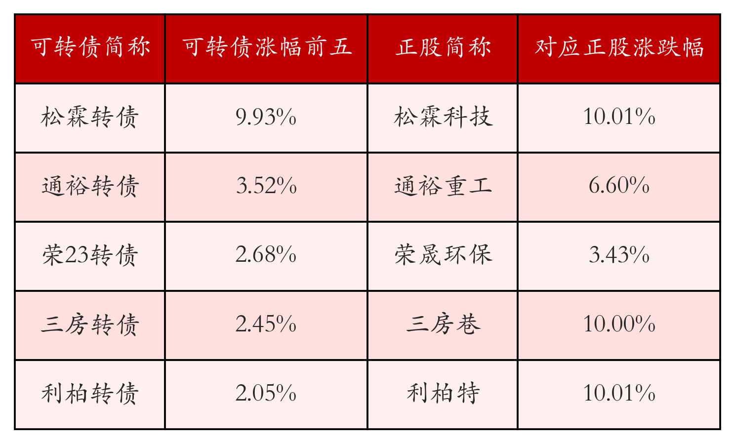 南财智讯3月17日电,盘后数据显示,债市方面,中证转债指数收跌1.53%,报499.07,成交额为598.95亿元。可转债方面,今日共成交361只可转债,其中25只收涨,0只收平,336只收跌。具体来看,5只可转债涨幅超过2%。其中松霖转债(113651)涨9.93%,通裕转债(123149)涨3.52%,荣23转债(113676)涨2.68%。今日有132只可转债跌幅超2%,家联转债(123236)跌10.54%,欧通转债(123241)跌8.49%,亿田转债(123235)跌8.23%。存在交易量的可转债所对应的正股中,61只收涨,4只收平,296只收跌。具体来看,7只可转债对应正股涨幅超过5%,其中,利柏特(605167)涨停,收涨10.01%;松霖科技(603992)涨停,收涨10.01%;三房巷(600370)涨停,收涨10.0%。同时所对应的可转债:利柏转债(111023)同涨2.05%;松霖转债(113651)同涨9.93%;三房转债(110092)同涨2.45%。今日有29只可转债对应正股跌幅超过5%,没有正股跌停。