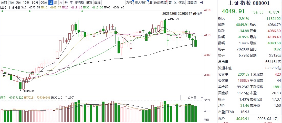3月17日,上证指数高开震荡,早盘一度向上发起攻势,挑战多条短期均线反压,但就在短暂站上4100点整数关口后,上方抛压蜂拥而至,上证指数也随之一路走低,最终在全日次低点收盘。深证成指同样呈现高开回落走势,午后跌幅持续扩大,收盘进一步接近60日均线。