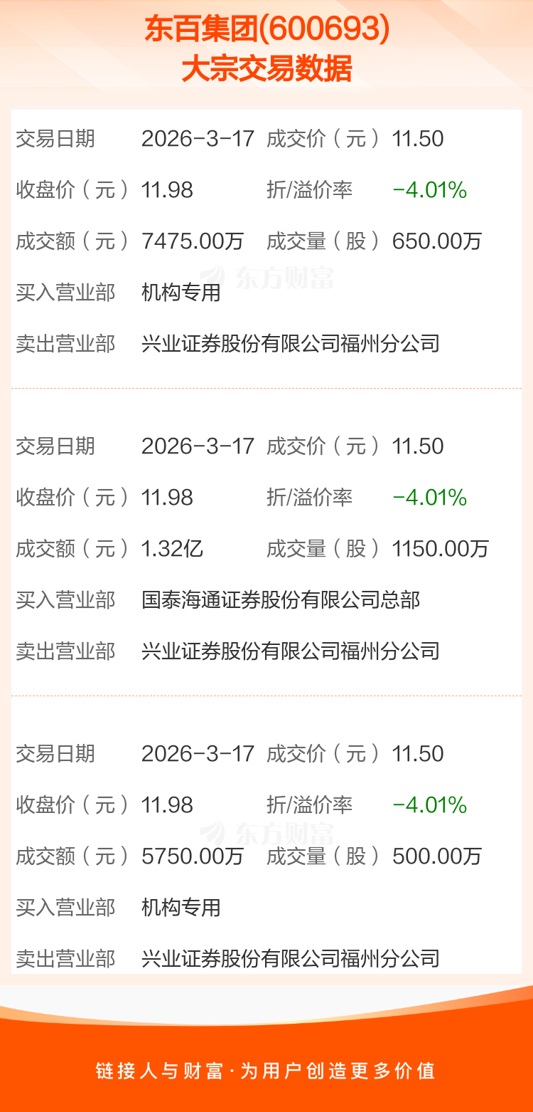 2026年3月17日,东百集团发生3笔大宗交易,共成交2300.00万股,成交金额2.65亿元,占其流通市值比例为2.54%。