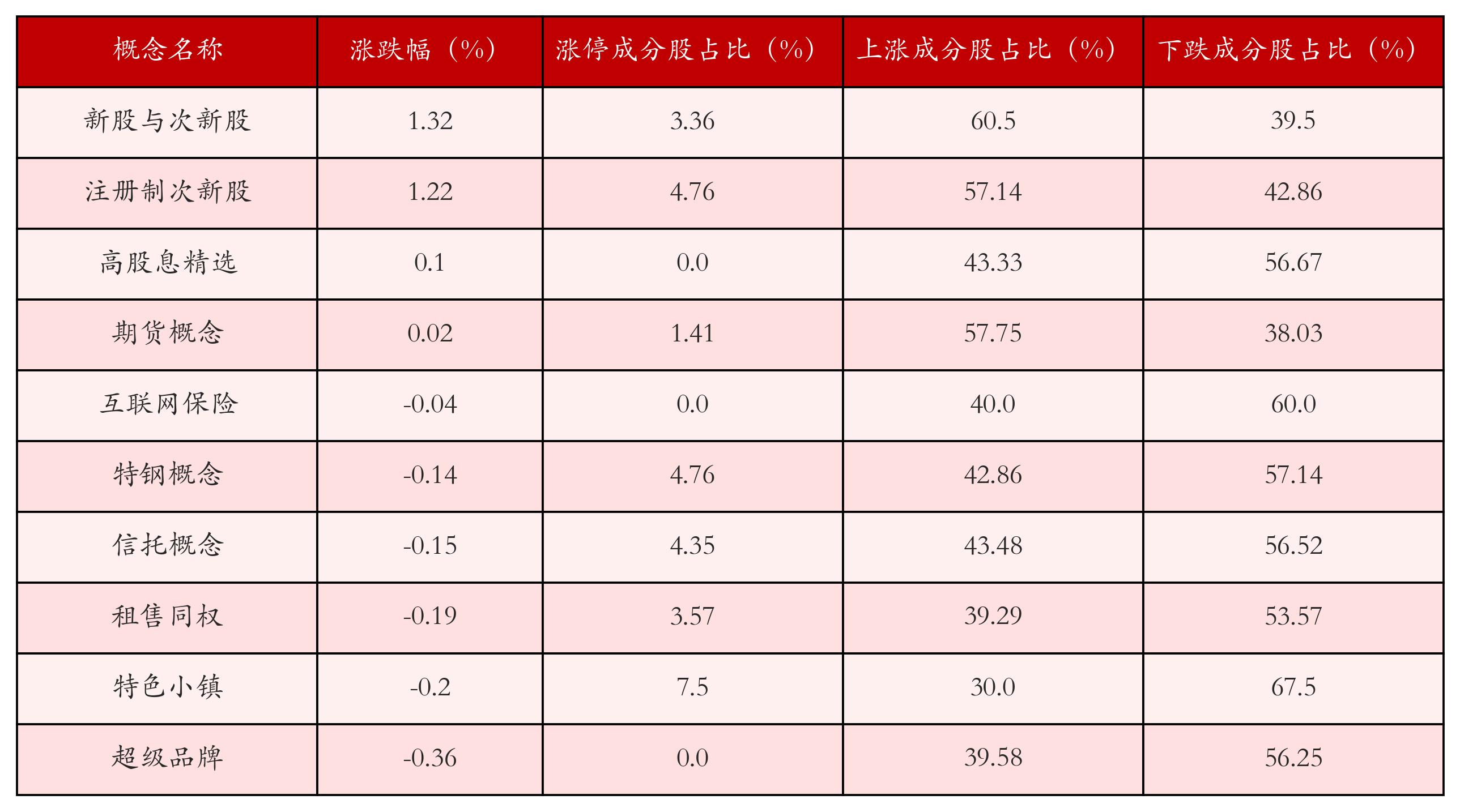 根据A股概念涨跌幅与所对应的股票池综合分析,涨幅靠前的三个概念板块分别为:新股与次新股、注册制次新股与高股息精选。排名前10位的概念板块相关数据见下表: