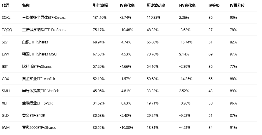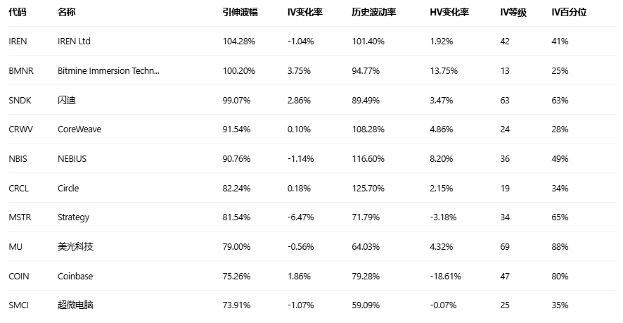 引申波幅排行榜(标的市值>10亿美元,且期权成交量>10万)