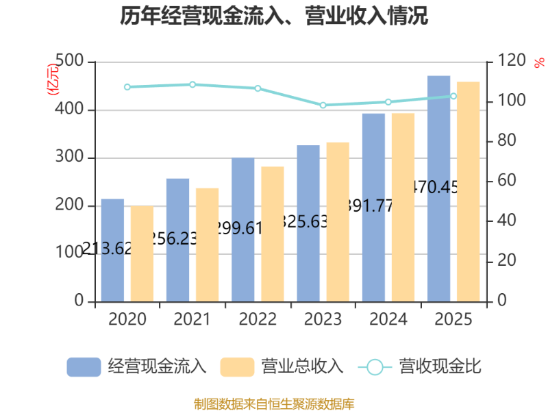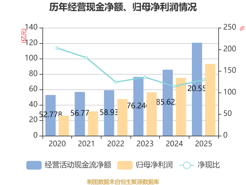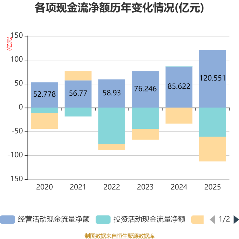 截至2025年,公司经营活动现金流净额为120.55亿元,同比增长40.79%;筹资活动现金流净额-51.7亿元,同比减少18.12亿元;投资活动现金流净额-60.99亿元,上年同期为5573.09万元。